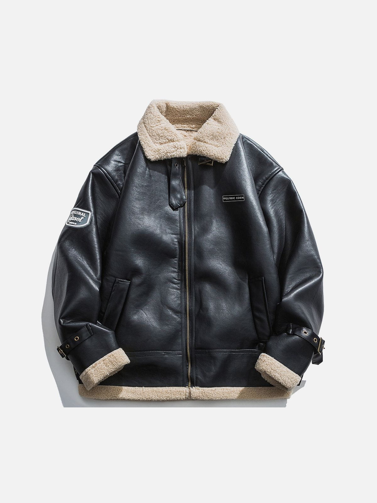 Zipper Lapel PU Borg Jacket