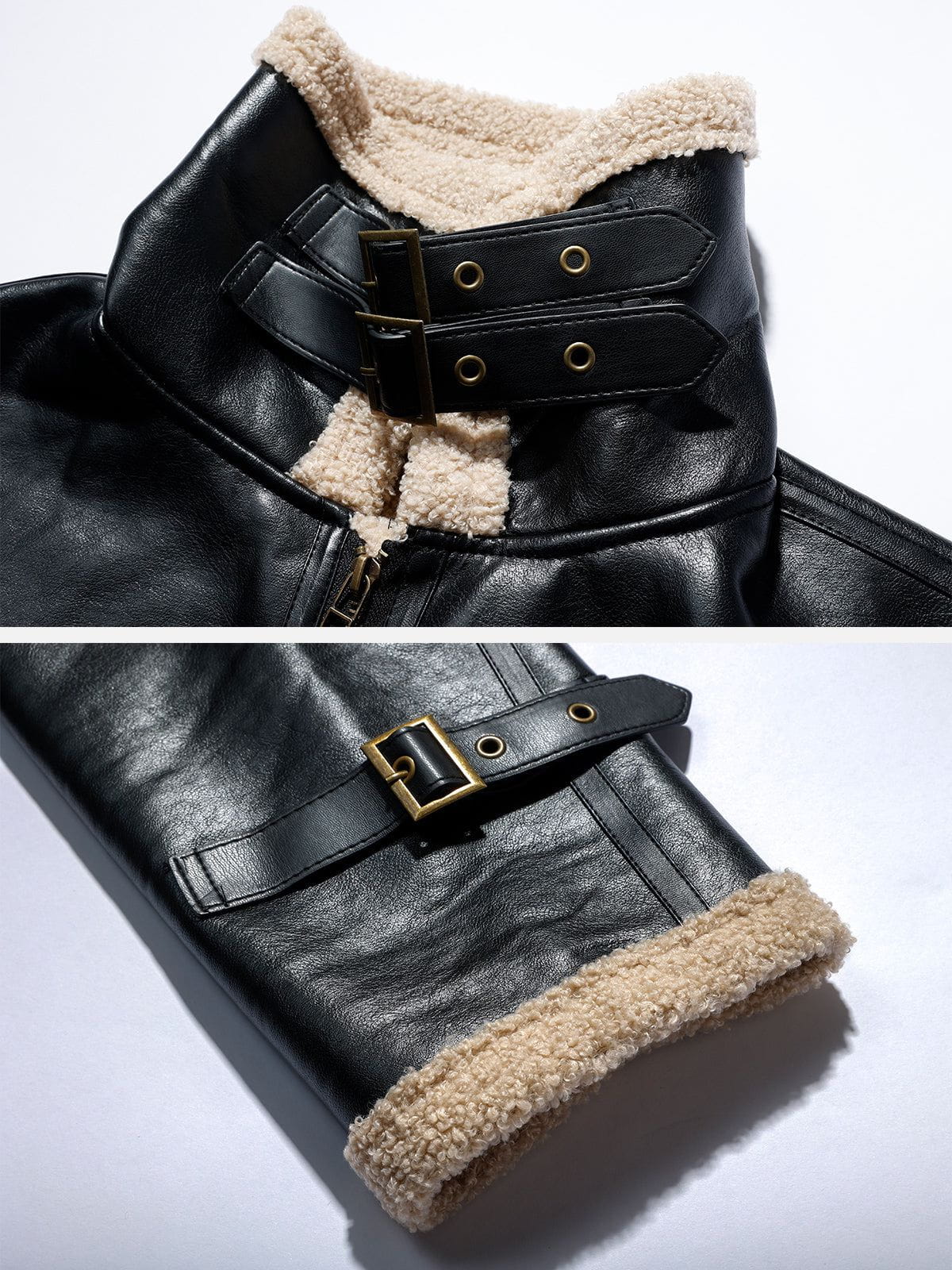 Adjustable button shearling cuffs + Adjustable button shearling hem