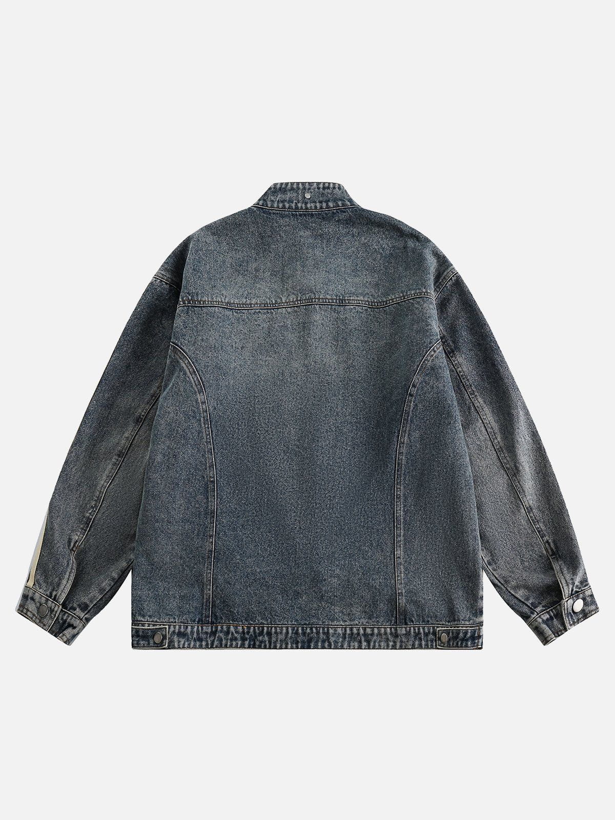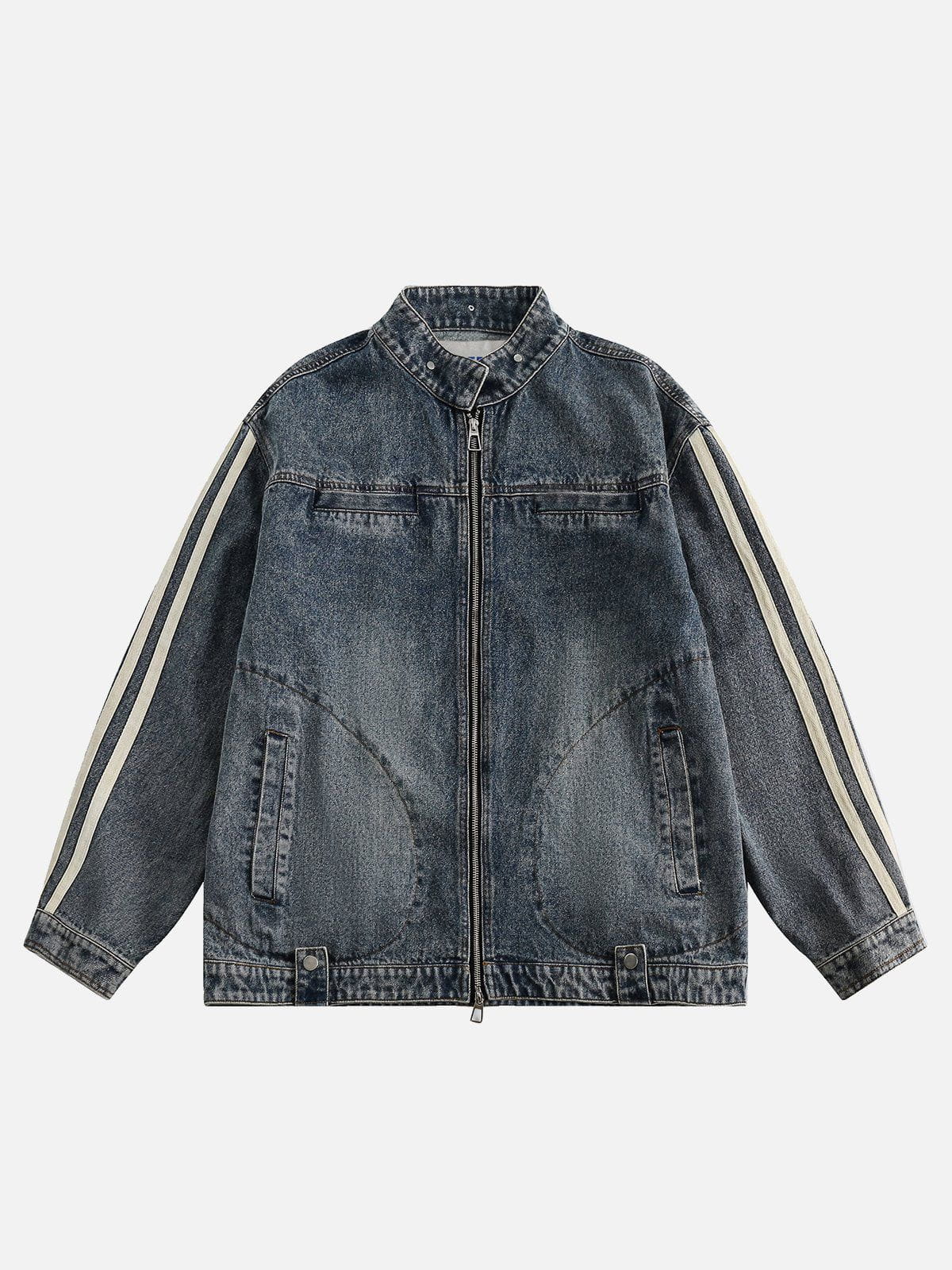 Unleash your inner racer with this Stripe Denim Racing Jacket. This high-octane piece features dynamic stripes that evoke the speed and energy of the racetrack. Crafted from premium denim, the jacket blends style and comfort seamlessly. With a nod to athletic aesthetics, it's a statement piece that effortlessly combines edginess with casual cool. Embrace the thrill of the track in this jacket, where fashion meets the fast lane.