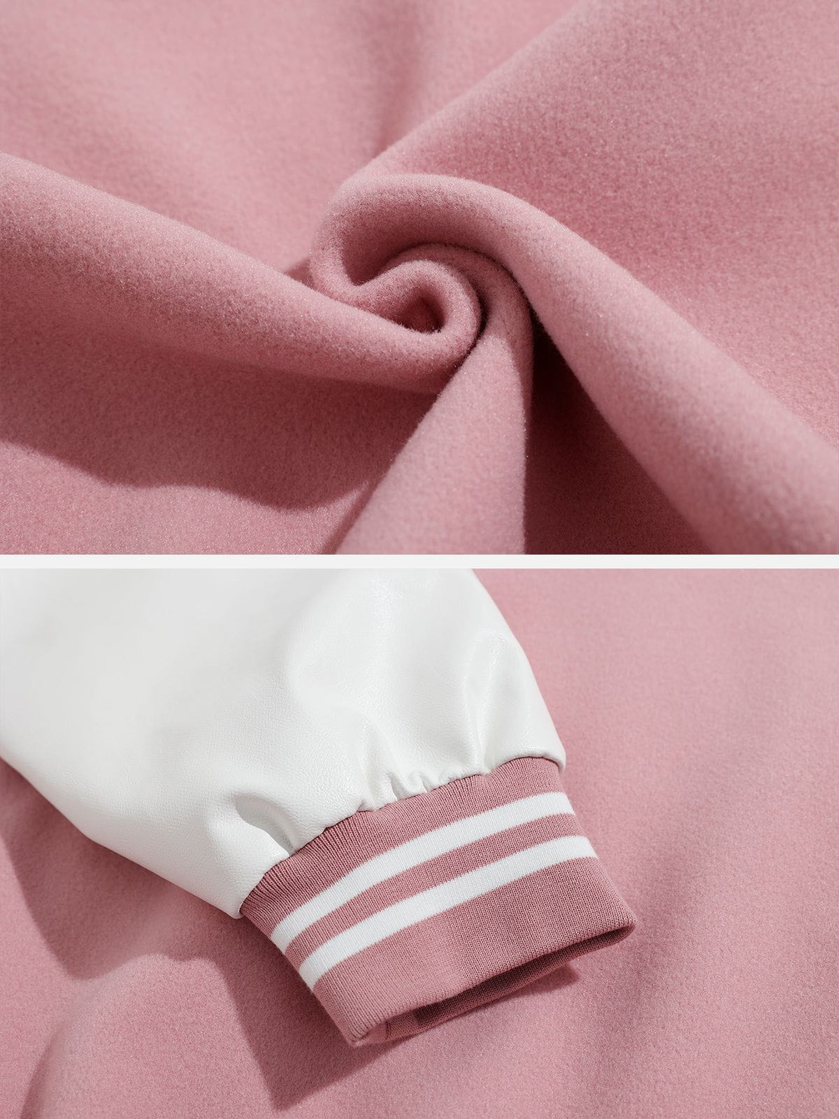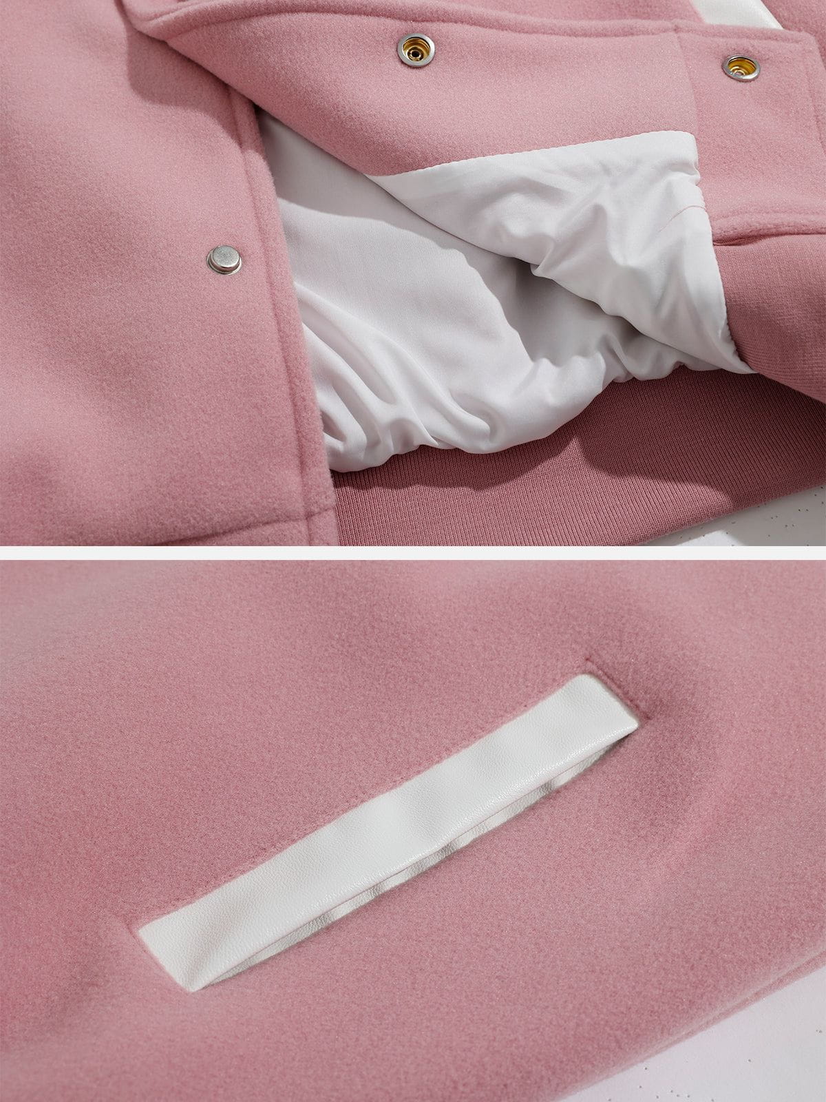 Description: Introducing our stylish varsity jacket with a playful twist! This jacket features a charming heart element on the back, adding a touch of sweetness to the classic sports-inspired design. The jacket is available in a delightful pink and white colorway, perfect for adding a pop of color to any outfit!