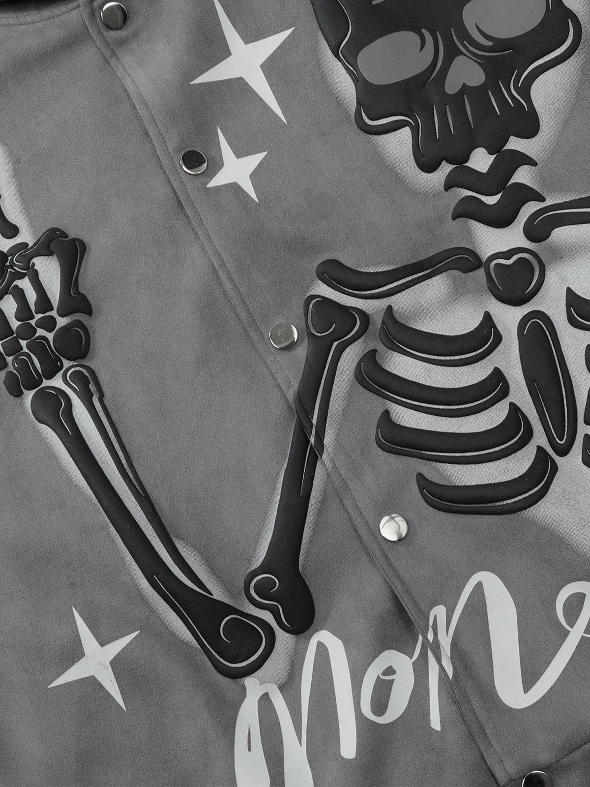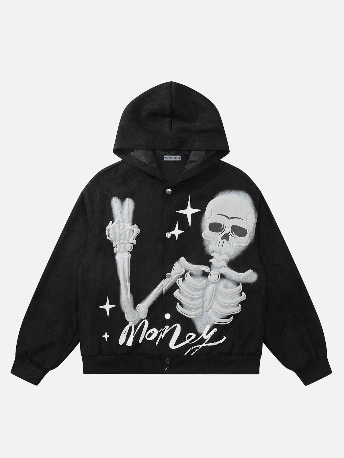 Stay warm and stylish with the Skeleton Foam Print Hooded Jacket. Made with a unique skeleton foam print design and a hood for extra protection, this jacket offers both fashion and function. Perfect for those looking for a modern and edgy addition to their wardrobe.