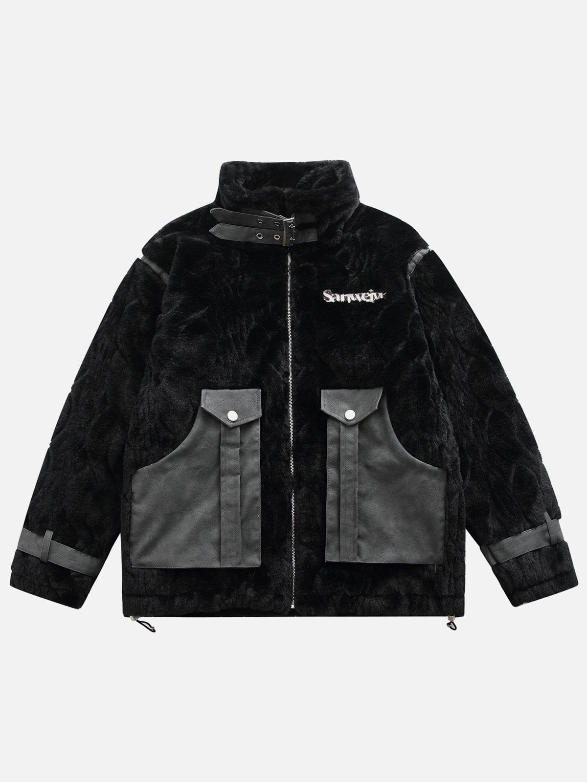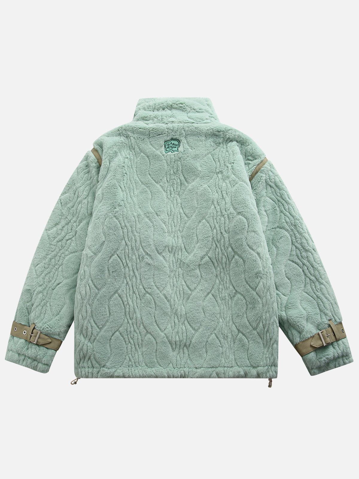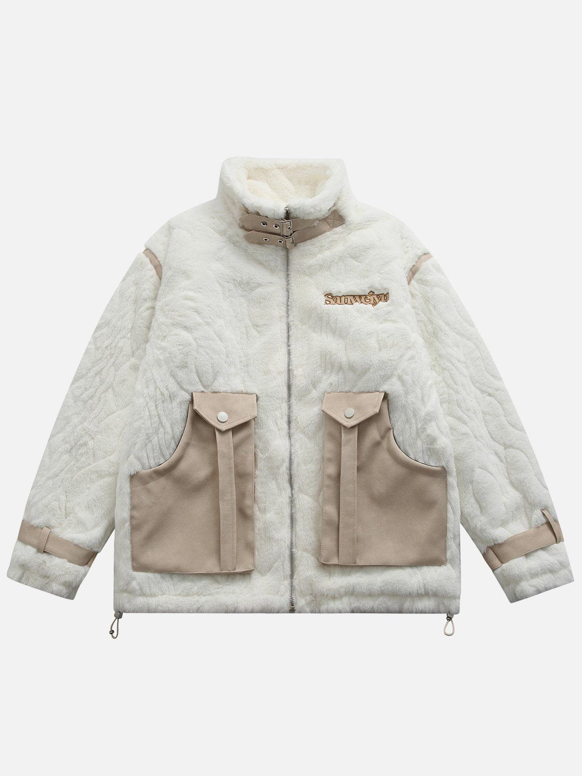 Quilted coat with fluffy sherpa fabric. Adjustable collar with strap. Adjustable tabs at sleeves. Front pockets.